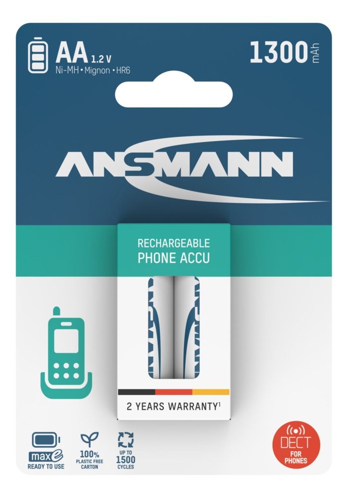 1300 mAh NiMH MaxE DECT telefoon batterijen van Ansmann zijn zeer goede oplaadbare AA batterijen voor toepassingen die niet veel energie behoeven, of bijvoorbeeld DECT telefoon. Gebruik deze NiMH HR6 1300 mAh oplaadbare DECT batterijen dus niet voor toepassingen met een hoge energiebehoefte. Door de MaxE technologie lopen de 1300mAh batterijen bijna niet leeg als ze niet gebruikt worden. Dit type DECT 1300 mAh oplaadbare AA batterijen wordt aangeboden als blisterverpakking met 2 oplaadbare AA batterijen per verpakking. Oplaadbare AA batterijen zijn 1,2V en zijn de vervangers voor 1,5V alkaline batterijen.